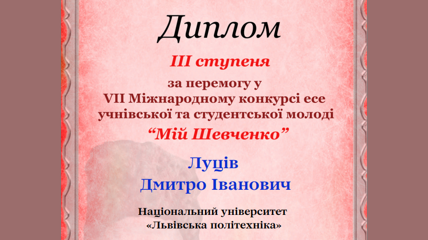 З-поміж 130 учасників, які представляли більш ніж 40 провідних закладів вищої освіти України, диплом за ІІІ місця здобув студент кафедри міжнародної інформації Інституту прикладної математики та фундаментальних наук Львівської політехніки Дмитро Луців. Науковий керівник дипломанта – завідувач кафедри МІ професор Василь Гулай.